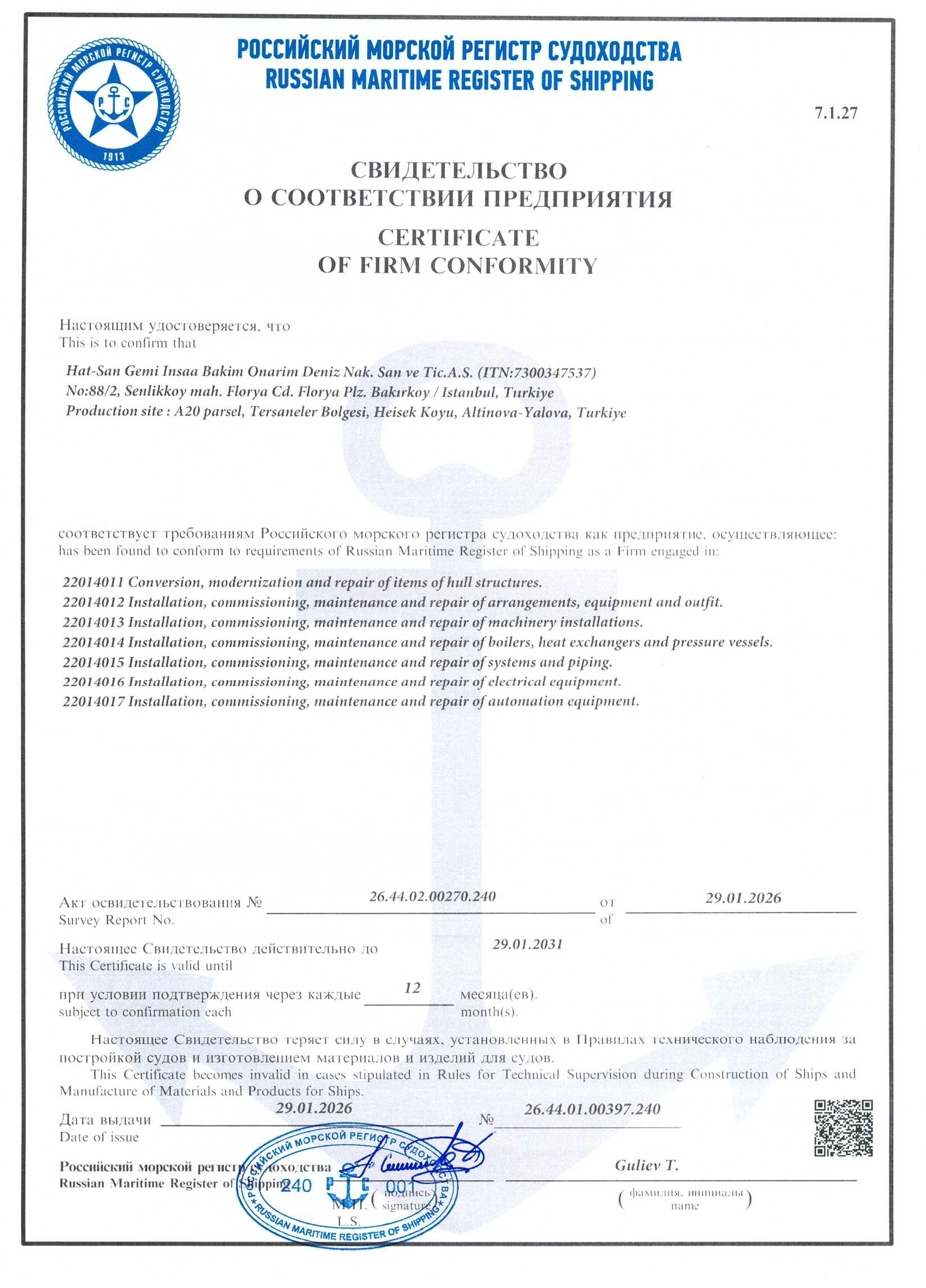 Hat-san Shipyard has the Facility Security Certificate which is issued by NATO, Euro-Atlantic Defense Industries and the Republic of Turkey the Ministry of Defense.